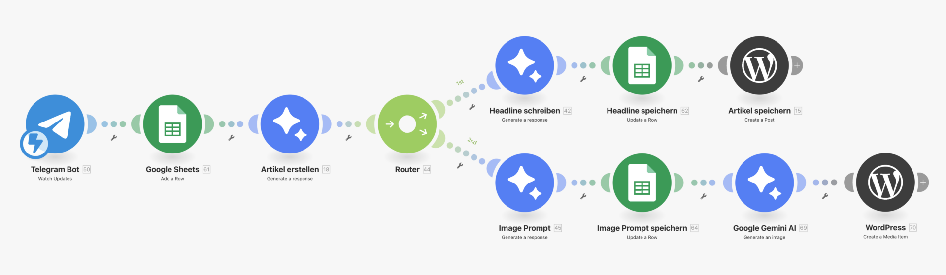 Theorie ist gut, aber erst die Praxis zeigt den wahren Wert. Mein Abschlussprojekt für den Kurs ist der Beweis dafür, dass Automatisierung und Kreativität keine Gegensätze sind. Ich habe einen teilautomatisierten Blog-Workflow entwickelt, der mir den Rücken freihält. Der Prozess ist so simpel wie effektiv: Ich schicke meinen Input (das kann ein Halbsatz sein, oder ein paar zusammenhängende Gedanken) einfach über Telegram ab. Im Hintergrund greift eine Automatisierung diese Daten, erstellt daraus einen strukturierten Artikel, erstellt ein passendes Header-Bild in einem zuvor festgelegten Stil und legt das Ergebnis fertig formatiert als Entwurf in meinem WordPress ab.